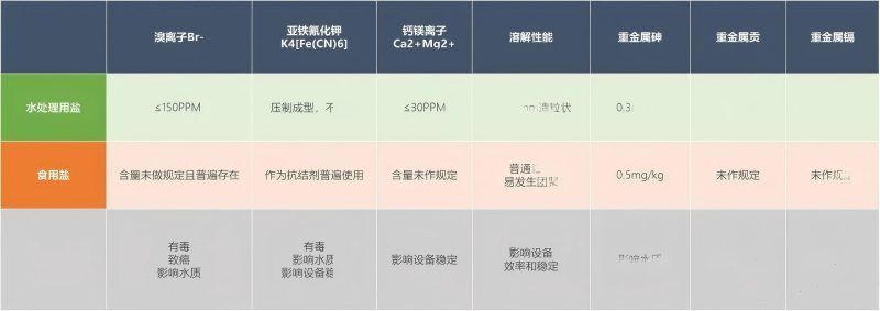 然而,食用盐国标GB/T5461中,并未针对水处理应用环境做出适用性说明;食用盐中的微量溴素成分在电解作用下,会产生有毒致癌物,影响自来水水质安全;食用盐中的抗结剂,在电解过程中会产生三价铁等副产物,对设备稳定运行及寿命产生影响,增加维护成本。而水处理用盐针对与电解应用相关的一系列微量元素做出了严格的控制。以食用盐代替水处理用盐的行业行为暂时属于国家监管空白地带。